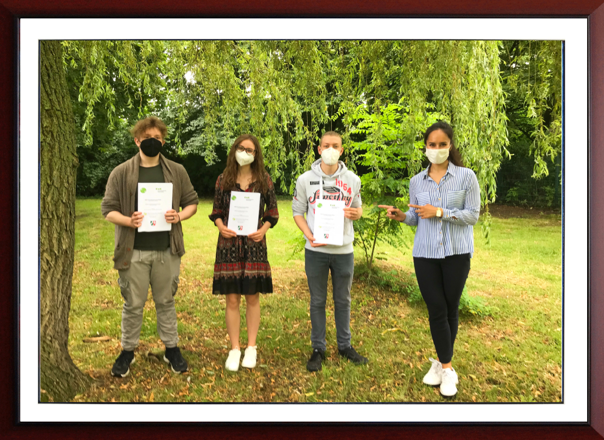 Mit Bravur haben Alexandra Ulinici, Leo Heim und Calvin Jansen aus der Unter- und Mittelstufe des Beruflichen Gymnasiums den schriftlichen sowie den mündlichen Teil des KMK-Fremdsprachenzertifikats abgeschlossen. Dazu gehören die Prüfungsteile: Hören, Lesen, Produktion (englischen Fachtext verfassen), Mediation und Interaktion (mündlicher Prüfungsteil).