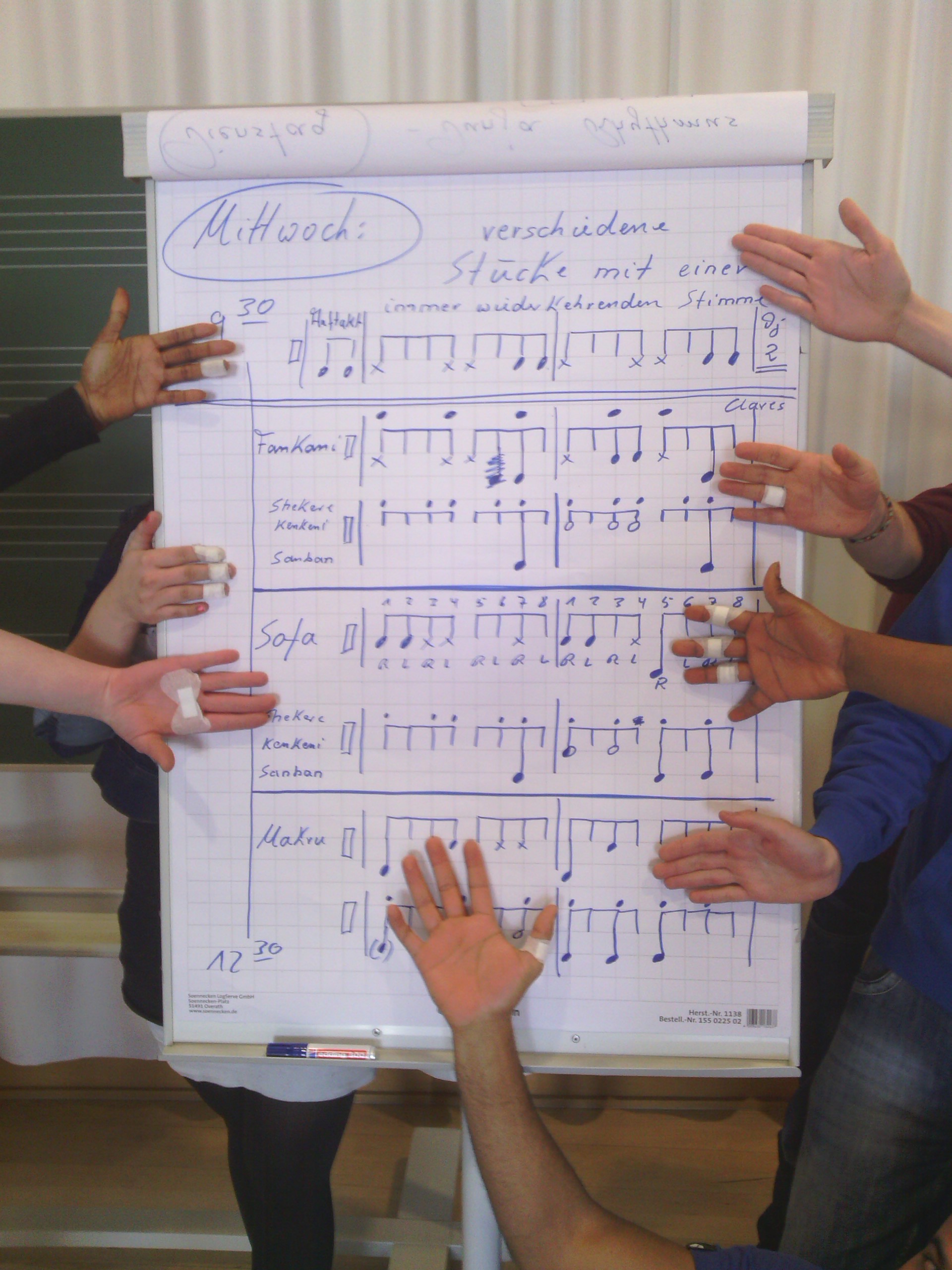 Die Tage waren komplett von morgens bis abends, nur unterbrochen von den Mahlzeiten, mit Proben gefüllt. es gab viel zu üben, denn wir hatten mehrere afrikanische Trommelstücke, bestehend aus mehreren Instrumentalstimmen und einen brasilianischen Tanz mit Stöcken – Makulele – genannt einzustudieren.