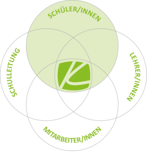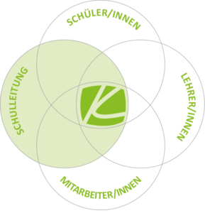 Gleichzeitig ist uns bewusst, dass wir in ganz unterschiedlichen Funktionen und Rollen Schule gestalten. Die vier ineinander verwobenen Kreise sind Ausdruck der gemeinsamen Verantwortung. Darüber hinaus hat jede einzelne Gruppe ihr Selbstverständnis ausgehend von den Fragen