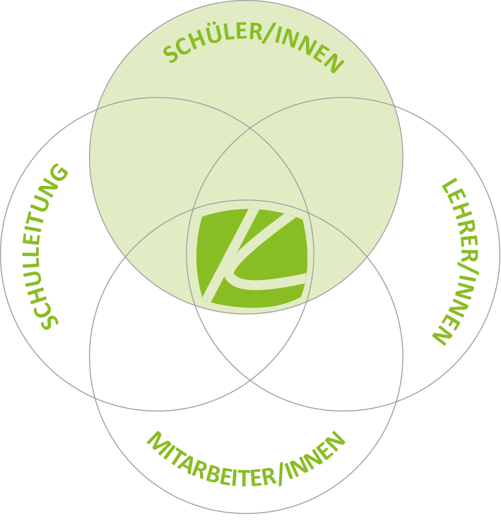 Gleichzeitig ist uns bewusst, dass wir in ganz unterschiedlichen Funktionen und Rollen Schule gestalten. Die vier ineinander verwobenen Kreise sind Ausdruck der gemeinsamen Verantwortung. Darüber hinaus hat jede einzelne Gruppe ihr Selbstverständnis ausgehend von den Fragen